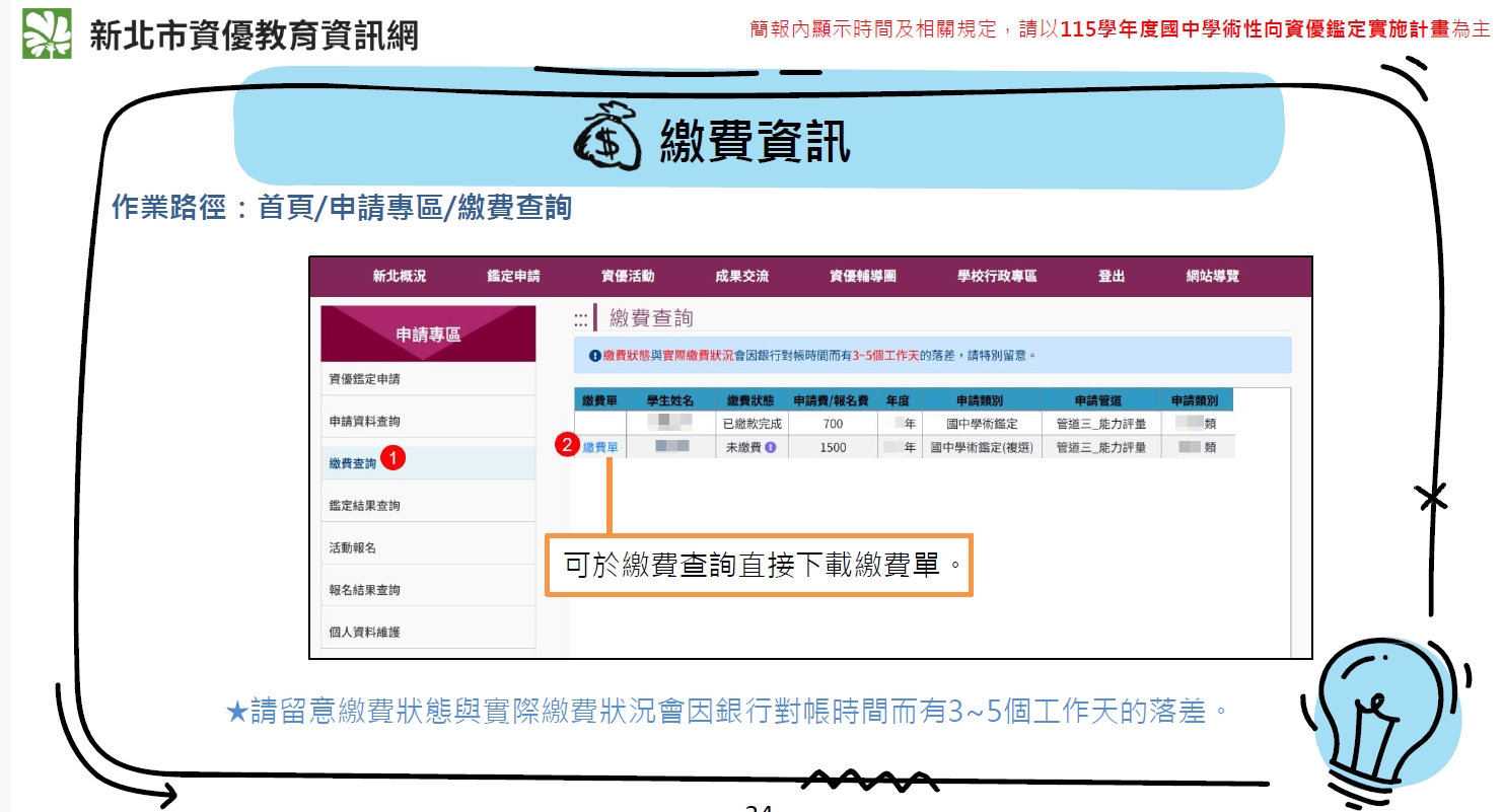 (1)請於115年4月1日(星期三)上午9時至4月8日(星期三)晚間24時,至新北資優資訊網(https://gifted.ntpc.edu.tw)列印複選繳費單並完成繳費,逾時未辦理者視同放棄。
